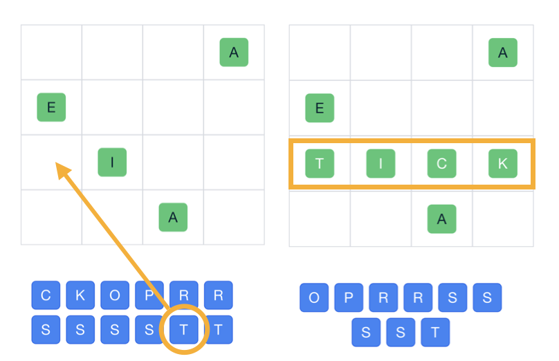 Drag blue letters into the puzzle to make 4 letter words. When a word is correct, the letters of the word will turn green. Use all of the blue letters to make 8 different interconnected words and solve the puzzle.